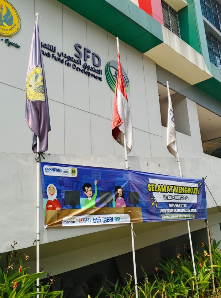 Foto: Tampak luar Gedung SFD UNJ dengan spanduk penyambutan peserta UTBK-SNBT 2026. (Sumber Foto: Dok. Pribadi)
